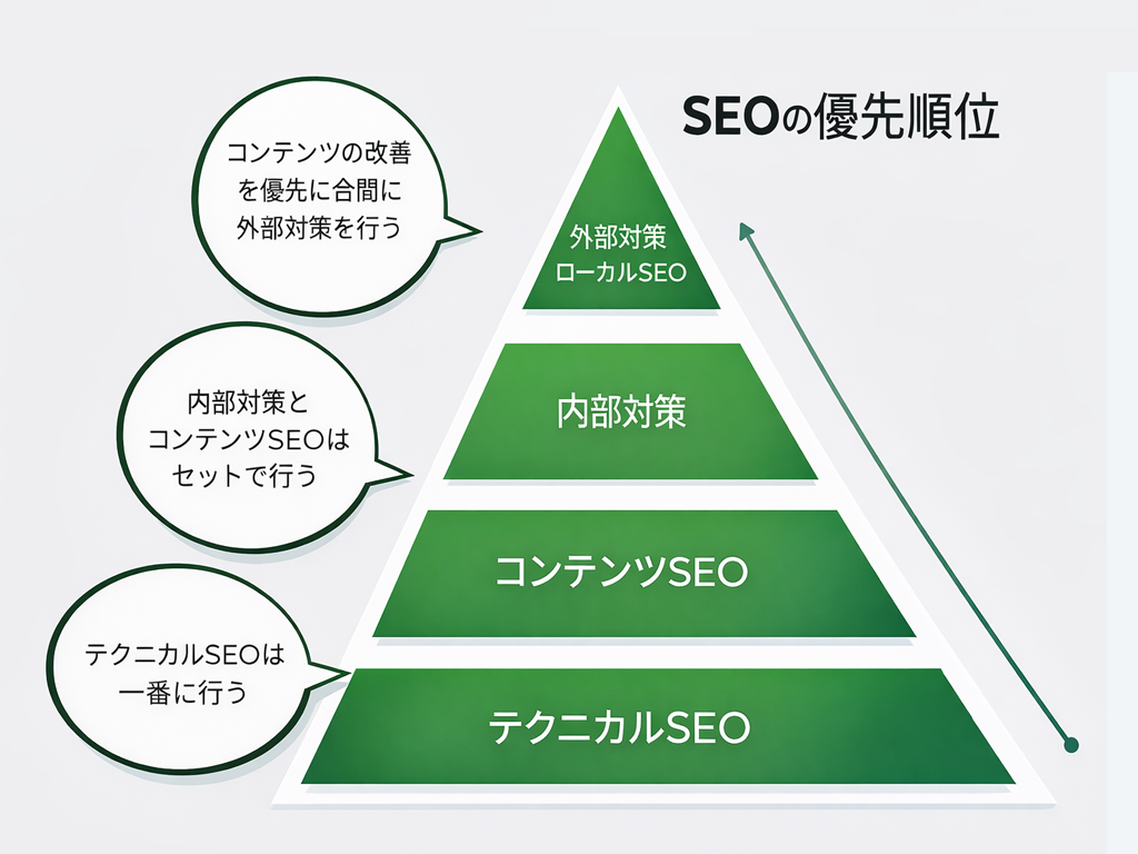 ちなみに、優先順位が高いものは、検索結果への表示にかかわる「テクニカルSEO」。次点で「コンテンツSEO」と「内部対策」とされています。